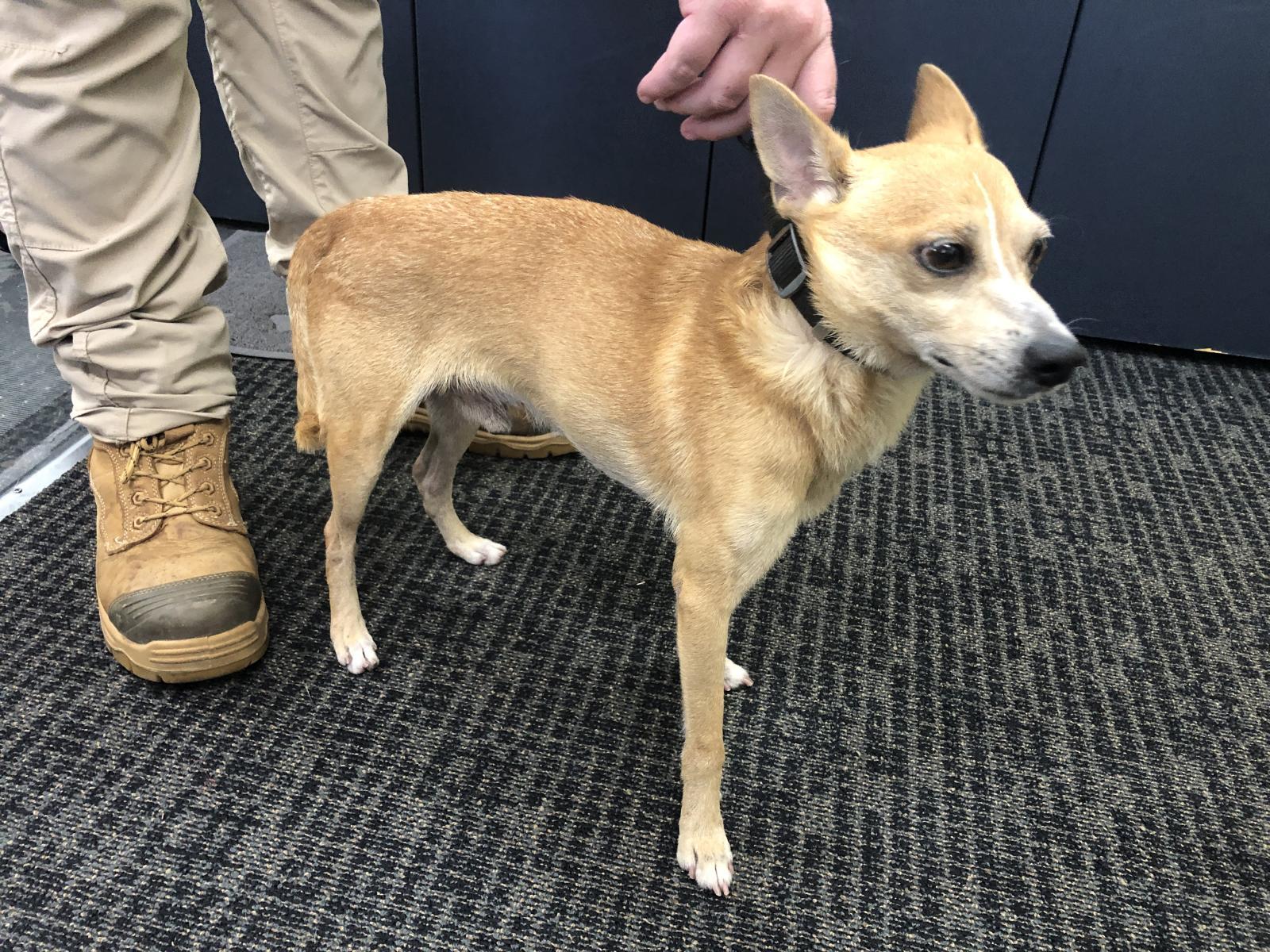 Entire male, adult, Chihuahua crossbreed, tan and white in colour, no microchip, wearing a collar and lead, unregistered with Council
