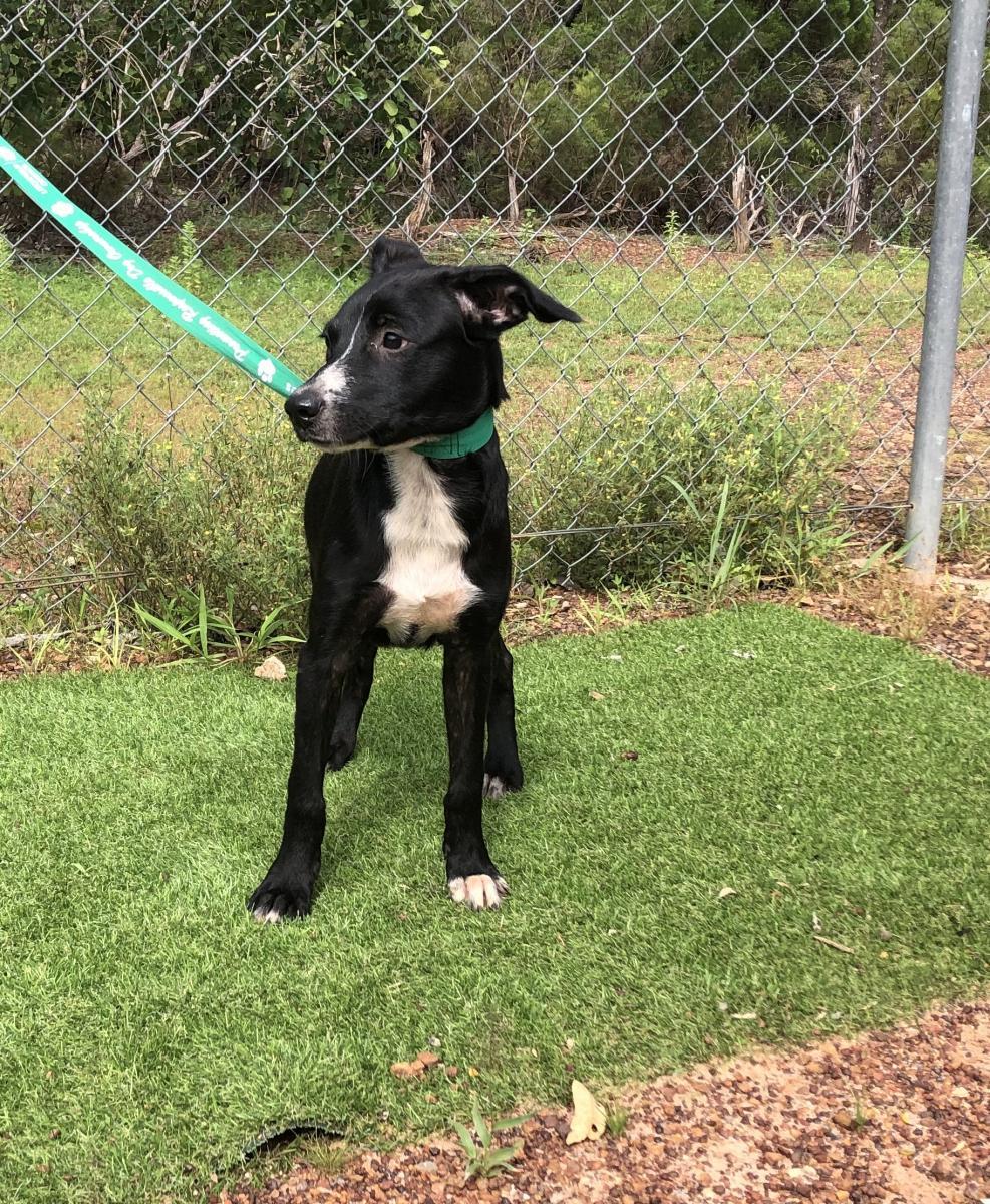 Entire Female Puppy, Cross Breed, Black with white patches and one white paw, no collar, not microchipped or registered with Council.